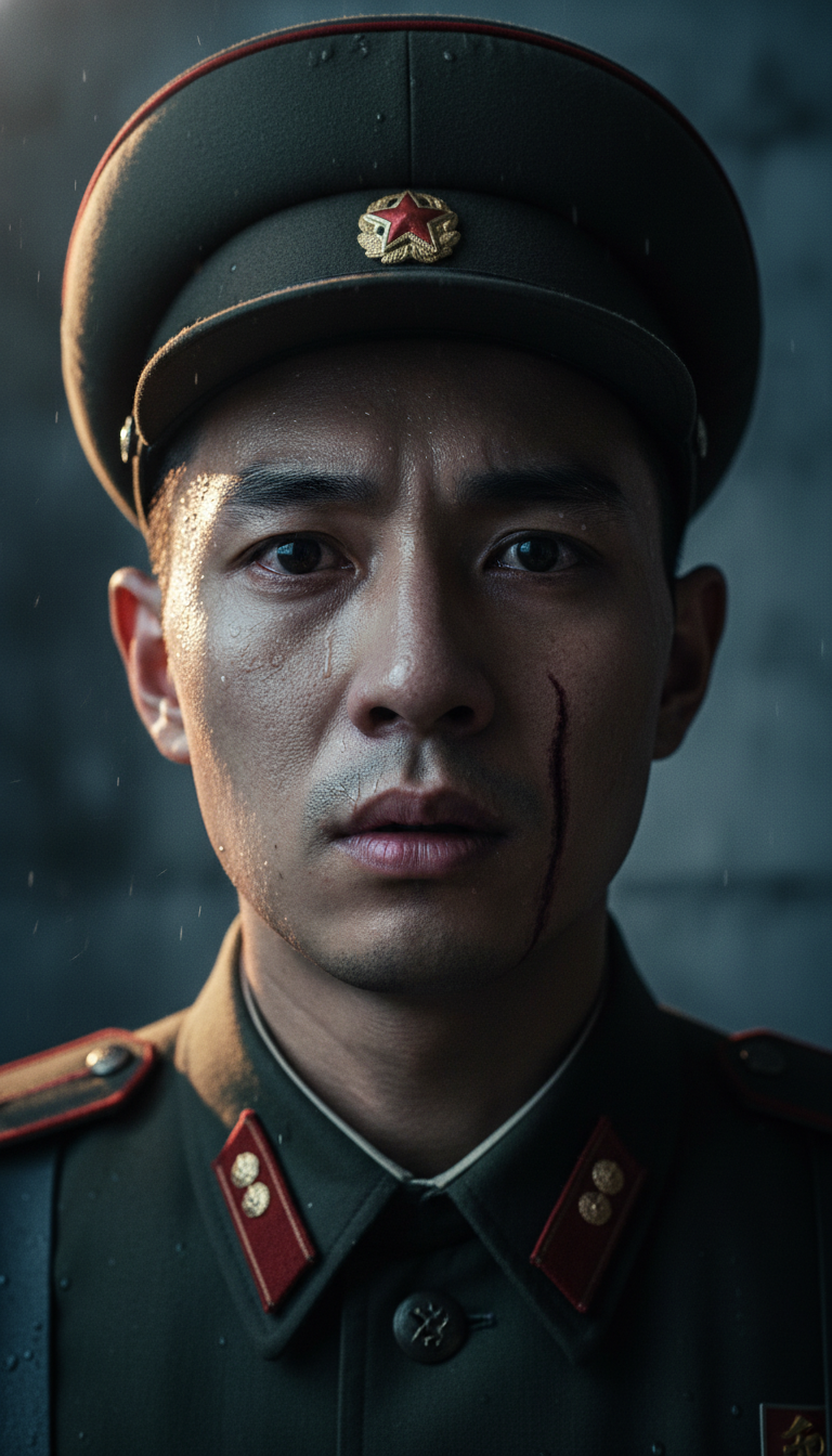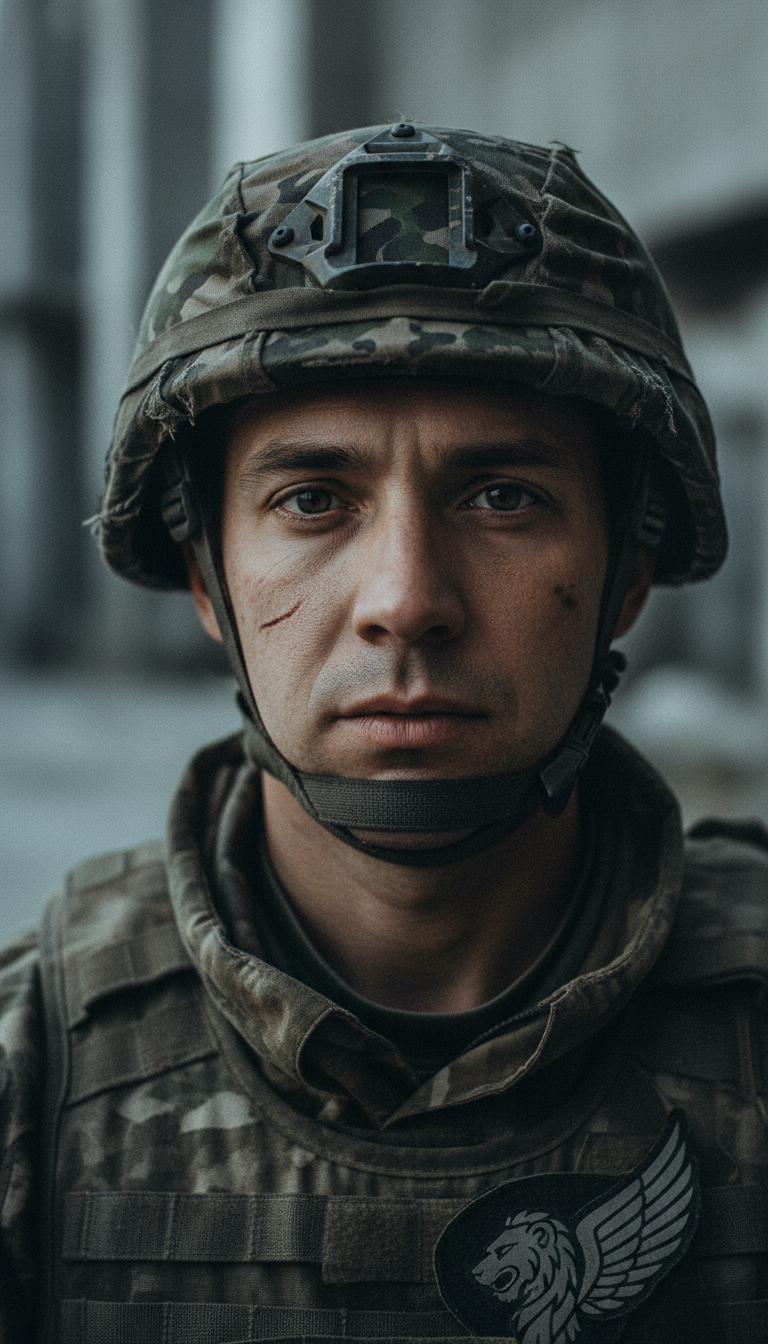 희망과 두려움이 교차하는 눈빛으로 정면을 응시하는 병사