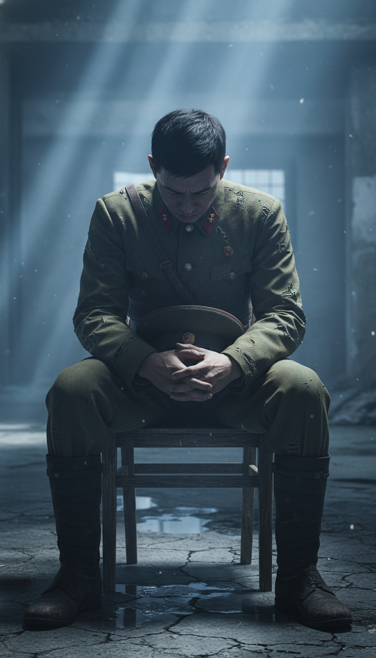 낡은 수용소 의자에 앉아 고개를 떨구고 눈물을 흘리는 병사