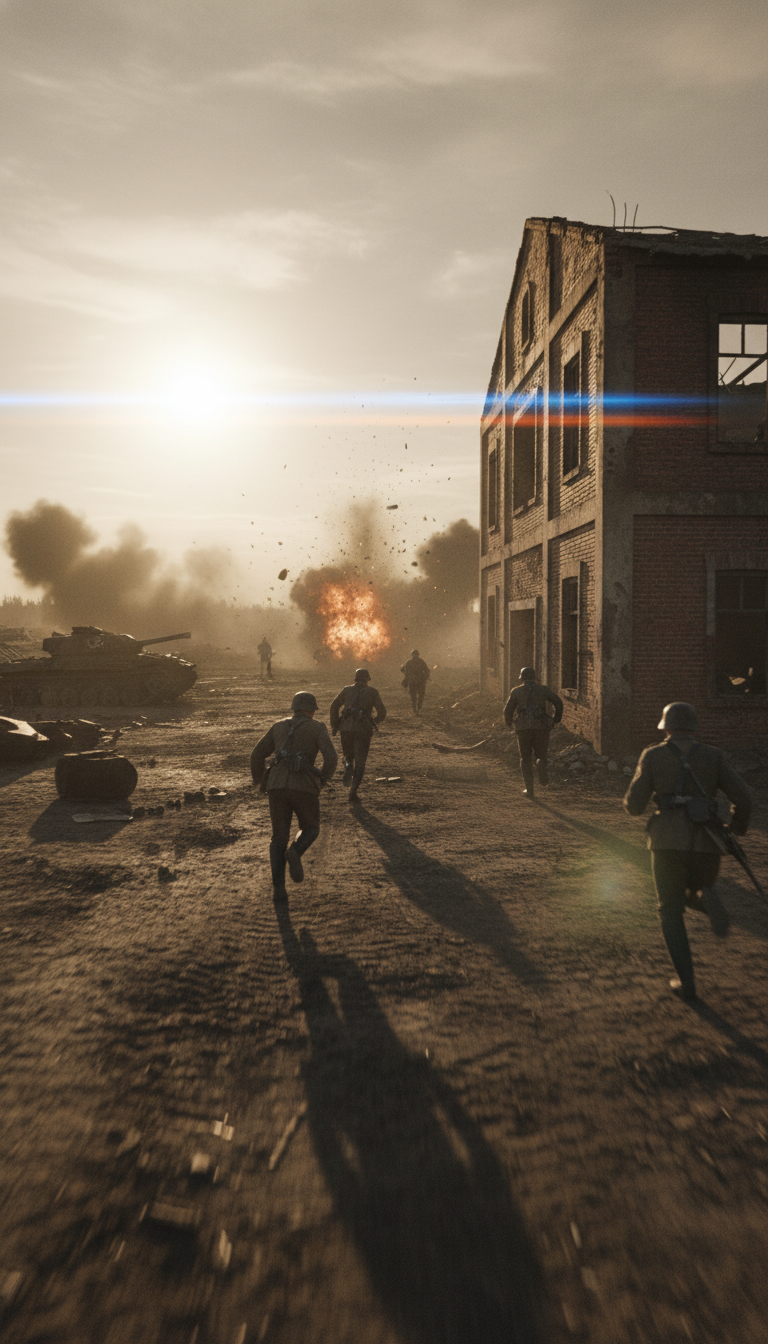 전쟁터의 폐허 속에서 드론 공격을 피해 도망치는 병사들의 긴박한 모습