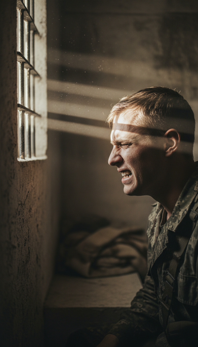 감옥 창살 사이로 들어오는 한 줄기 빛을 보며 절망하는 병사의 옆모습