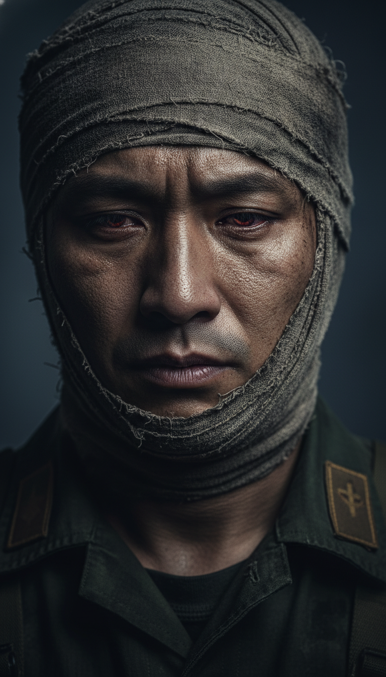 A dramatic close-up of a young Asian male soldier with bandages on his chin and face, looking down with an expression of deep regret and despair, dark cinematic interview lighting, 4k resolution.