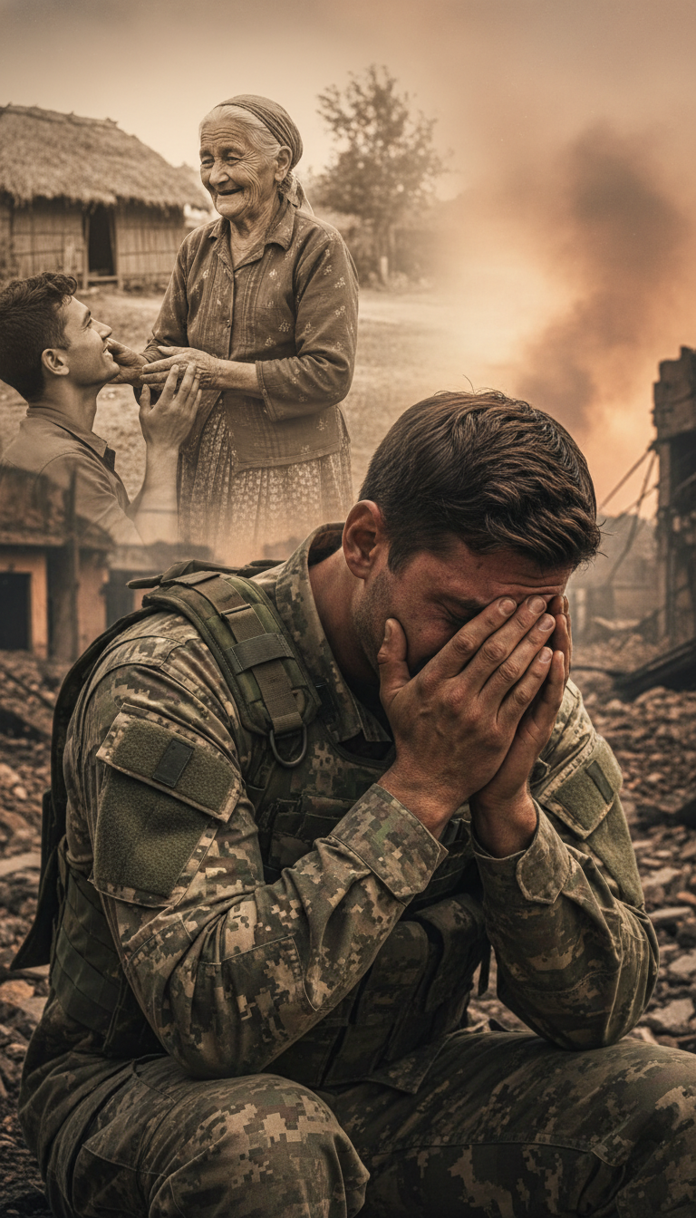 A split screen. Left: The injured soldier crying with his head in his hands. Right: A mental image of an elderly North Korean woman standing in a bleak rural village, faded colors.