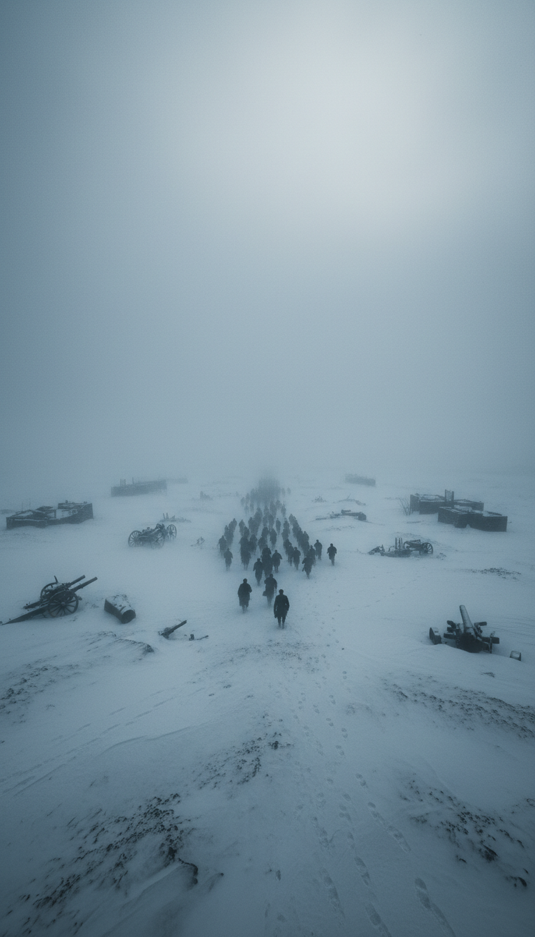 A wide shot of a vast, snowy desolate plain in Russia. Thousands of faint, ghostly silhouettes of soldiers marching into the mist, cold and melancholic tone.