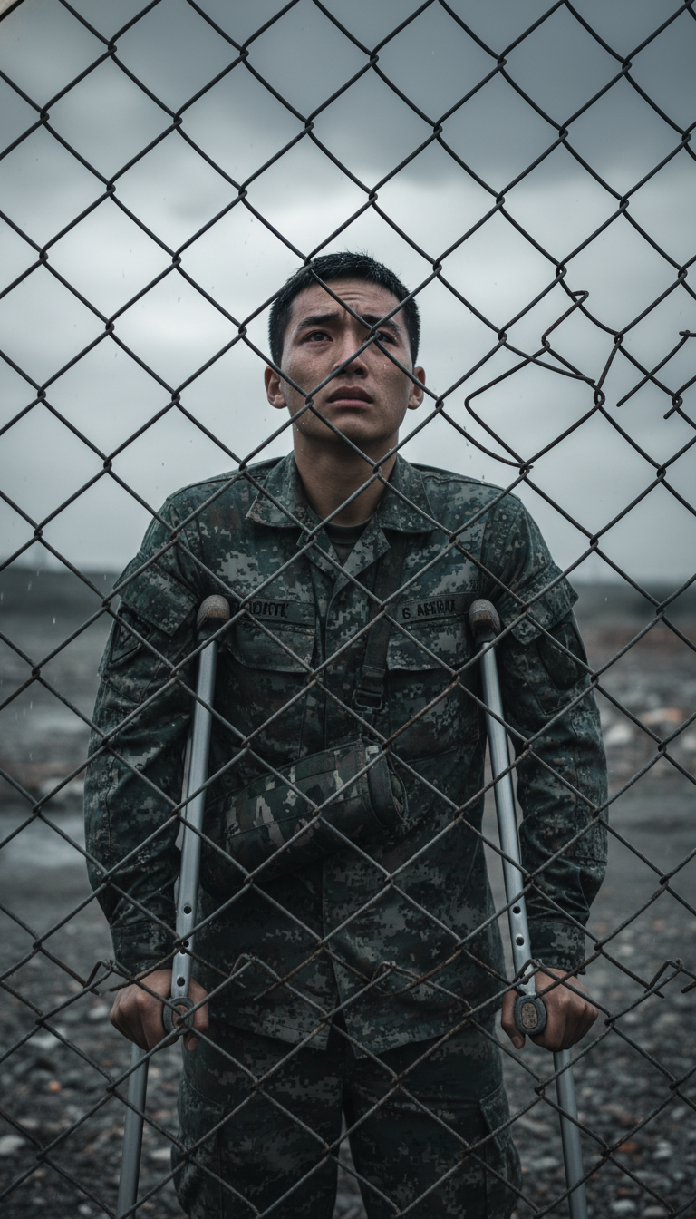 A soldier on crutches standing behind a wire fence, looking up at a gray gloomy sky, sharp focus on his sad eyes, high quality portrait.